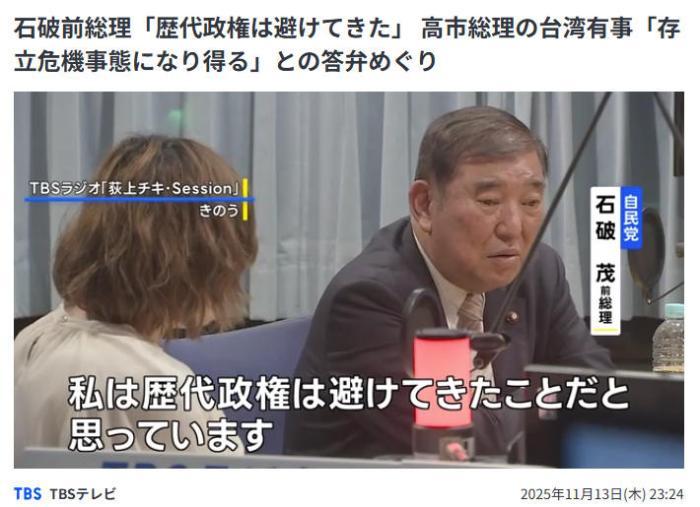 中新网11月14日电 近日,日本首相高市早苗公然发表涉台虚假言论,宣扬日本军事干预台海的可能性。对此,日本前首相石破茂、鸠山由纪夫、日本共产党委员长田村智子、日本最大在野党民主宪法党议员大筒宏等日本政界人士都曾提出批评。 11月13日,日本前首相石破茂在TBS广播节目中对高市的言论表示反对。图片来源:日本TBS新闻网报道截图 石破茂:高市反对日本历届政府的立场。 11月13日,日本前首相石破茂在TBS广播节目中宣布反对高市的言论。回应高一称“台湾发生的事情”可构成对于满足日本动用集体自卫权的“现有危机局势”,石破茂指出,这相当于日本政府目前考虑“在某些情况下会这样做”,而历届日本政府都“回避这样的表述”。石破茂还补充说,“在某些情况下才会这样做”的结论并不能提高所谓的威慑力。图片来源:鸠山由纪夫社交账号截图。鸠山由纪夫:日方不应干涉中国内政。对于高市的言论,日本前首相鸠山由纪夫也在个人社交媒体账号上发布了一系列帖子来佐证。 11月8日,鸠山发表文章批评高一的言论,“或许是为了扩大危机,为日本强化军事力量寻找借口”。鸠山强调:“日本尊重台湾是中国一部分的事实。台湾“问题纯属中国内政,日本不应干涉。”11月11日,鸠山再次在社交媒体发文称“日本不应干涉中国内政。”11月11日,日共委员长田村智子在国会质问高市早苗。图片来源:日本阿贝玛新闻报道截图 田村智子:高市煽动军事紧张局势。11月11日,日共委员长田村智子在国会质问高市早苗。日本在国会询问高一早苗:“一个国家的首席大臣在国会中将台湾称为一个地区,并预设了具体的冲突例子。这本身就等于煽动军事危机。你的言论在国内外影响很大。”激活集体自卫权的前提条件是,日本即使没有受到攻击或入侵,也必须向他国派遣自卫队使用武力。他要求高市收回相关言论t。田村接着说:“一个国家的首相不应该在议会发表煽动危机的言论。首相应该做什么?首相不应该坚持这个立场吗?各自,“并用这种精神作为现在未来日中关系的基础。”大串宏:高市的演讲正在走向战争。11月10日,日本最大在野党日本立宪民主党议员大串宏向高市早苗指出在议会局势中:“这被认为是‘现有危机局势’,这意味着将部署国防军,这是走向战争的企图。”历届内阁都对此类言论进行过评判。保持克制。 “据此,大津宏要求高一立即收回有关言论。11月13日,中国外交部发言人林坚在例行会议上表示,日本首相继续不肯离开。日方必须r 所有后果(终止)。