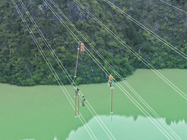 10月22日,在汉江郧阳区青山镇皮帕滩村段,国网十堰供电公司电力工作人员踩着飞行装置,系上安全绳,手持扳手在高空输电线路上安装线路附件。该线路计划于11月底安装完毕,将为西武高铁湖北段涧六铺、东河牵引站提供可靠的电力保障。通讯员 郝金鑫 摄